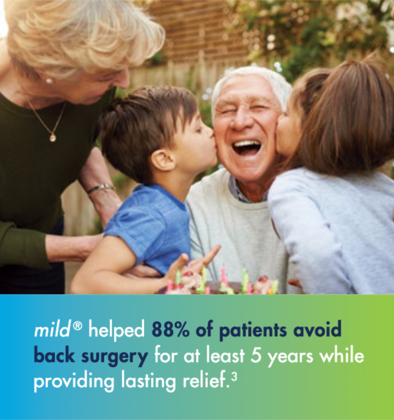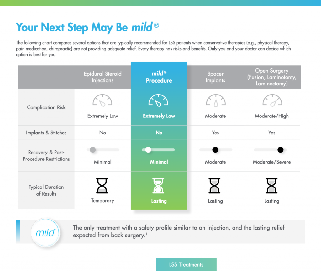 mild® is a short, outpatient treatment for lumbar spinal stenosis (LSS) that restores space in the spinal canal to help improve back and leg pain.* Using specialized tools and imaging, mild® addresses a major root cause of LSS by removing thickened ligament through an incision smaller than the size of baby aspirin, leaving no implants behind, only a Band-Aid.